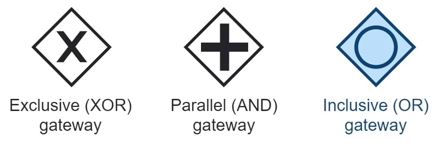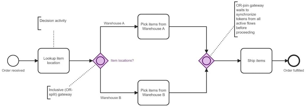 • The inclusive (OR-split) gateway will activate all true outbound branches. In other words, it enables “and-or” logic: items can be located in Warehouse A and-or Warehouse B.